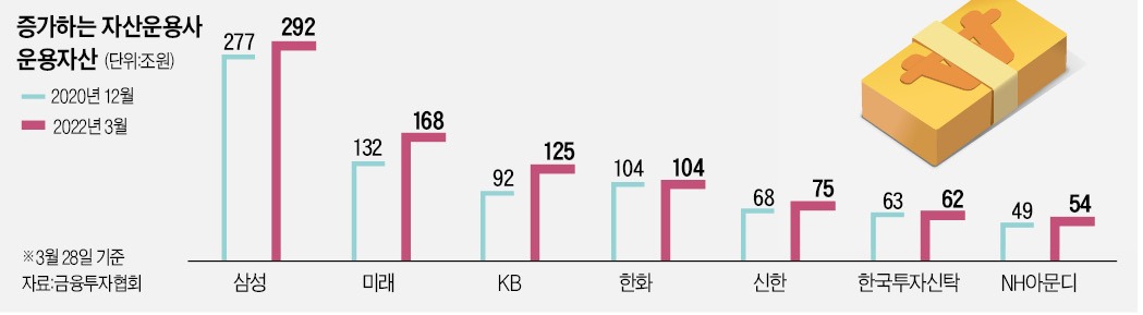 해외 운용자산을 합치면 격차는 더 줄어든다. 지난달 말 기준 미래에셋자산운용의 해외 운용자산은 97조원인데, 이를 합하면 운용자산은 265조원으로 불어난다.
