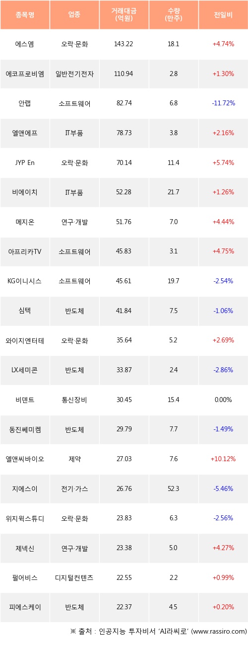 외국인 투자자의 순매수 상위 20개 종목은 에스엠, 에코프로비엠, 안랩, 엘앤에프, JYP Ent., 비에이치, 메지온, 아프리카TV, KG이니시스, 심텍등이다.