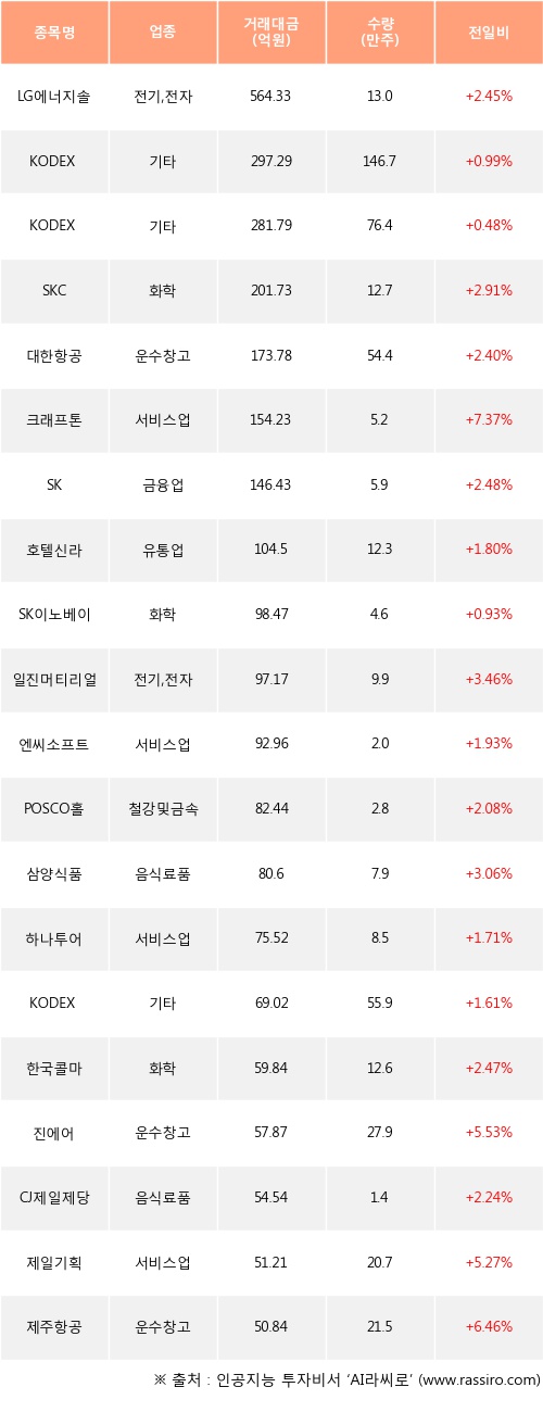기관 투자자의 순매수 상위 20개 종목은 LG에너지솔루션, KODEX 레버리지, KODEX 200, SKC, 대한항공, 크래프톤, SK, 호텔신라, SK이노베이션, 일진머티리얼즈등이다.