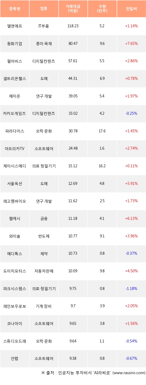 기관 투자자의 순매수 상위 20개 종목은 엘앤에프, 동화기업, 펄어비스, 셀트리온헬스케어, 메지온, 카카오게임즈, 파라다이스, 아프리카TV, 제이시스메디칼, 서울옥션등이다.