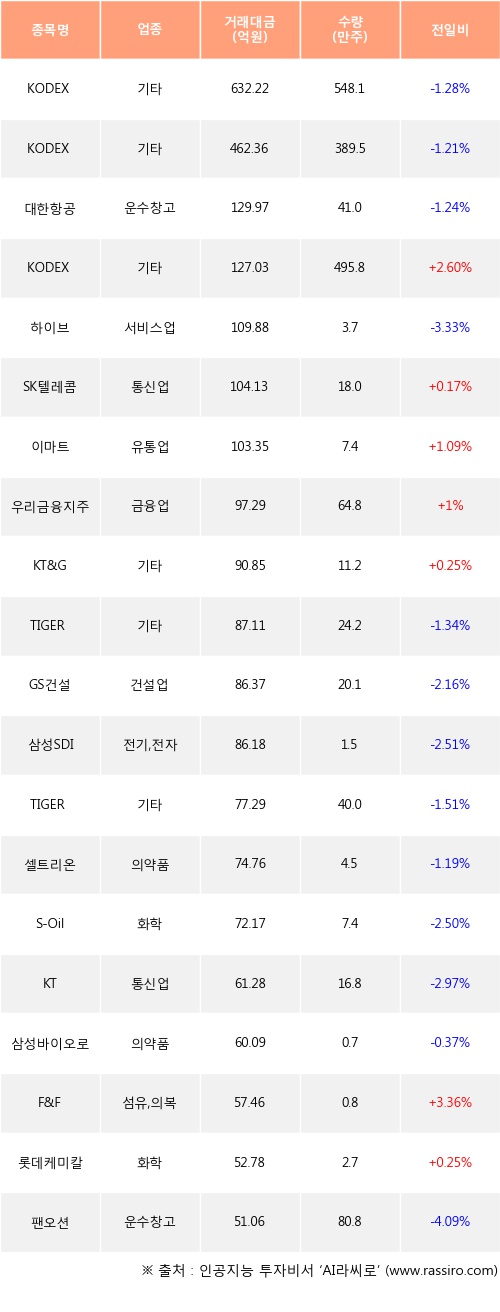 KODEX 200선물인버스2X, SK텔레콤, 이마트 등은 전일 대비 주가가 상승했고, KODEX MSCI Korea TR, KODEX 200TR, 대한항공 등은 주가가 하락했다.