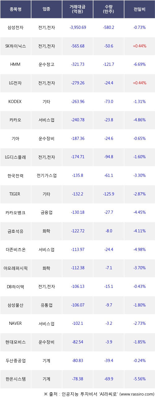 외국인 투자자의 순매도 상위 20개 종목은 삼성전자, SK하이닉스, HMM, LG전자, KODEX 200, 카카오, 기아, LG디스플레이, 한국전력, TIGER 미국필라델피아반도체나스닥등이다.
