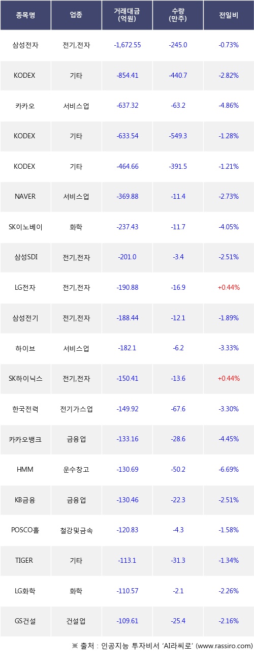 기관 투자자의 순매도 상위 20개 종목은 삼성전자, KODEX 레버리지, 카카오, KODEX MSCI Korea TR, KODEX 200TR, NAVER, SK이노베이션, 삼성SDI, LG전자, 삼성전기등이다.