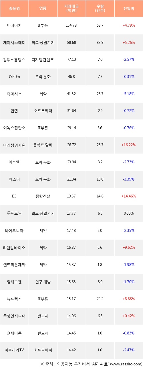 비에이치, 제이시스메디칼, 미래생명자원 등은 전일 대비 주가가 상승했고, 컴투스홀딩스, JYP Ent., 휴마시스 등은 주가가 하락했다.