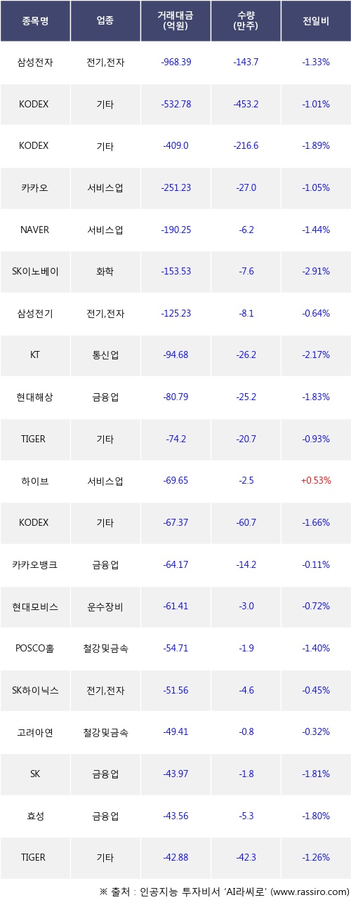 기관 투자자의 순매도 상위 20개 종목은 삼성전자, KODEX 200TR, KODEX 레버리지, 카카오, NAVER, SK이노베이션, 삼성전기, KT, 현대해상, TIGER 200등이다.