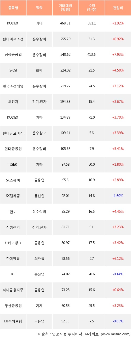 KODEX 200TR, 현대미포조선, 삼성중공업 등은 전일 대비 주가가 상승했고, SK텔레콤, KT, DB손해보험 등은 주가가 하락했다.