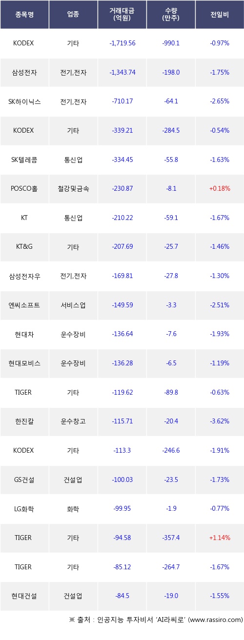 기관 투자자의 순매도 상위 20개 종목은 KODEX Top5PlusTR, 삼성전자, SK하이닉스, KODEX 200TR, SK텔레콤, POSCO홀딩스, KT, KT&G, 삼성전자우, 엔씨소프트등이다.