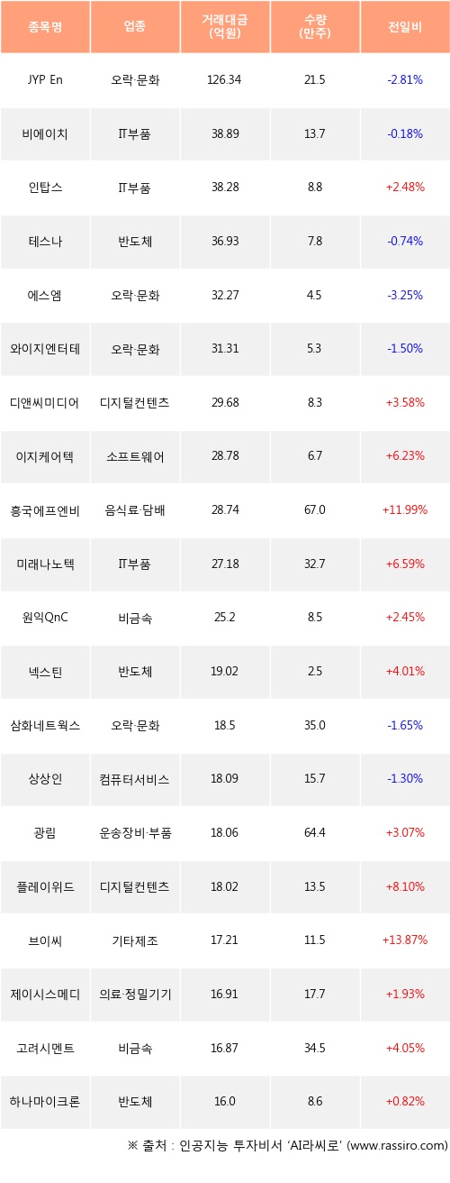 외국인 투자자의 순매수 상위 20개 종목은 JYP Ent., 비에이치, 인탑스, 테스나, 에스엠, 와이지엔터테인먼트, 디앤씨미디어, 이지케어텍, 흥국에프엔비, 미래나노텍등이다.
