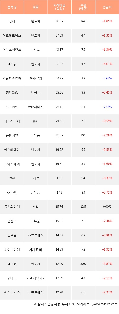 기관 투자자의 순매수 상위 20개 종목은 심텍, 이오테크닉스, 이녹스첨단소재, 넥스틴, 스튜디오드래곤, 원익QnC, CJ ENM, 나노신소재, 풍원정밀, 에스티아이등이다.