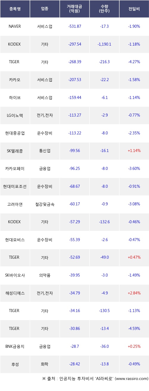 기관 투자자의 순매도 상위 20개 종목은 NAVER, KODEX 200선물인버스2X, TIGER 차이나전기차SOLACTIVE, 카카오, 하이브, LG이노텍, 현대중공업, SK텔레콤, 카카오페이, 현대미포조선등이다.