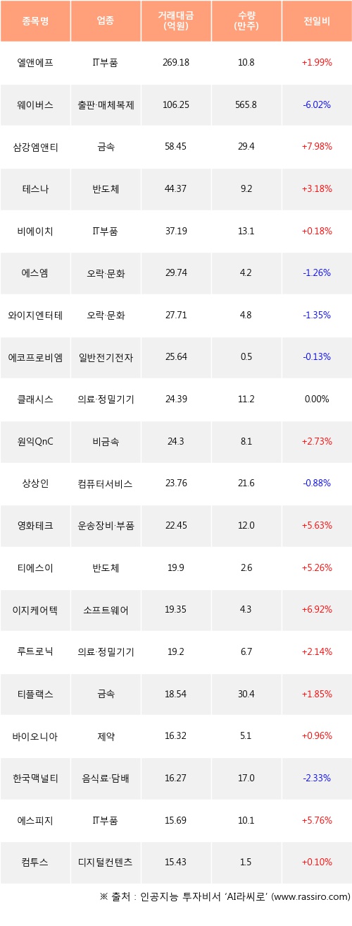 엘앤에프, 삼강엠앤티, 테스나 등은 전일 대비 주가가 상승했고, 웨이버스, 에스엠, 와이지엔터테인먼트 등은 주가가 하락했다.