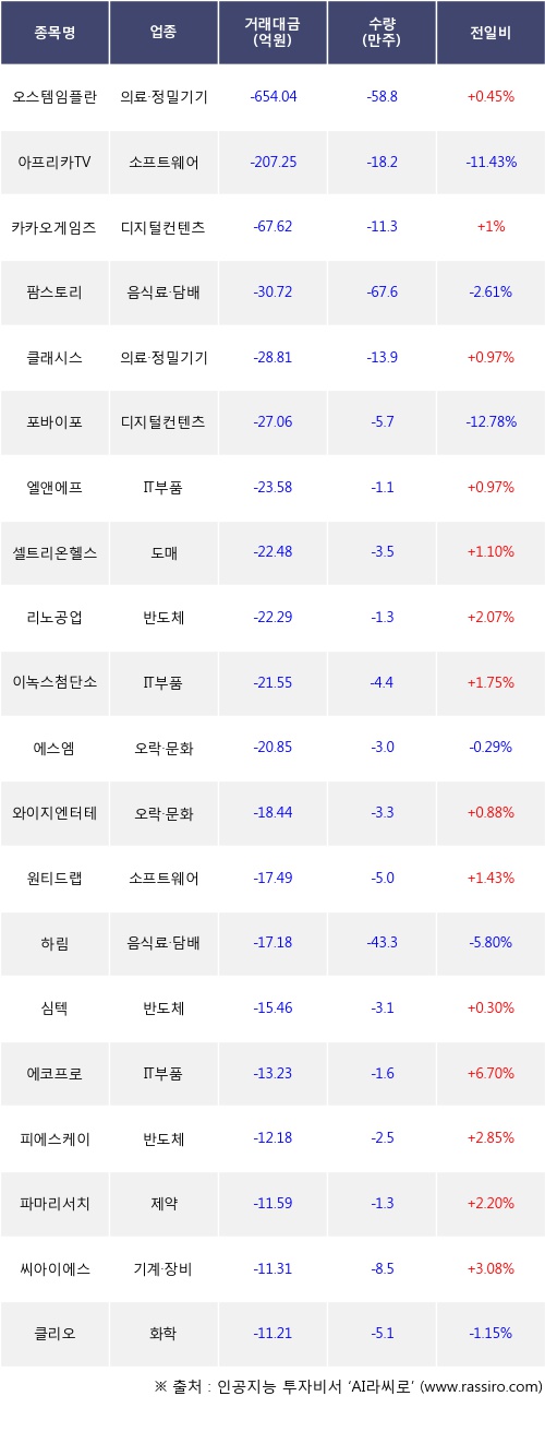 외국인 투자자의 순매도 상위 20개 종목은 오스템임플란트, 아프리카TV, 카카오게임즈, 팜스토리, 클래시스, 포바이포, 엘앤에프, 셀트리온헬스케어, 리노공업, 이녹스첨단소재등이다.