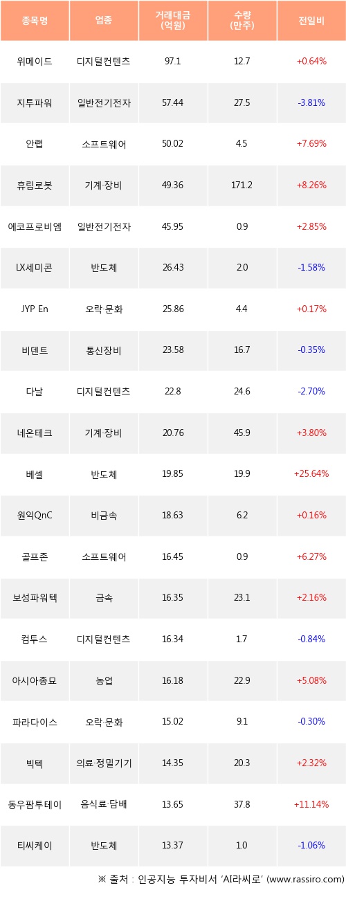 위메이드, 안랩, 휴림로봇 등은 전일 대비 주가가 상승했고, 지투파워, LX세미콘, 비덴트 등은 주가가 하락했다.