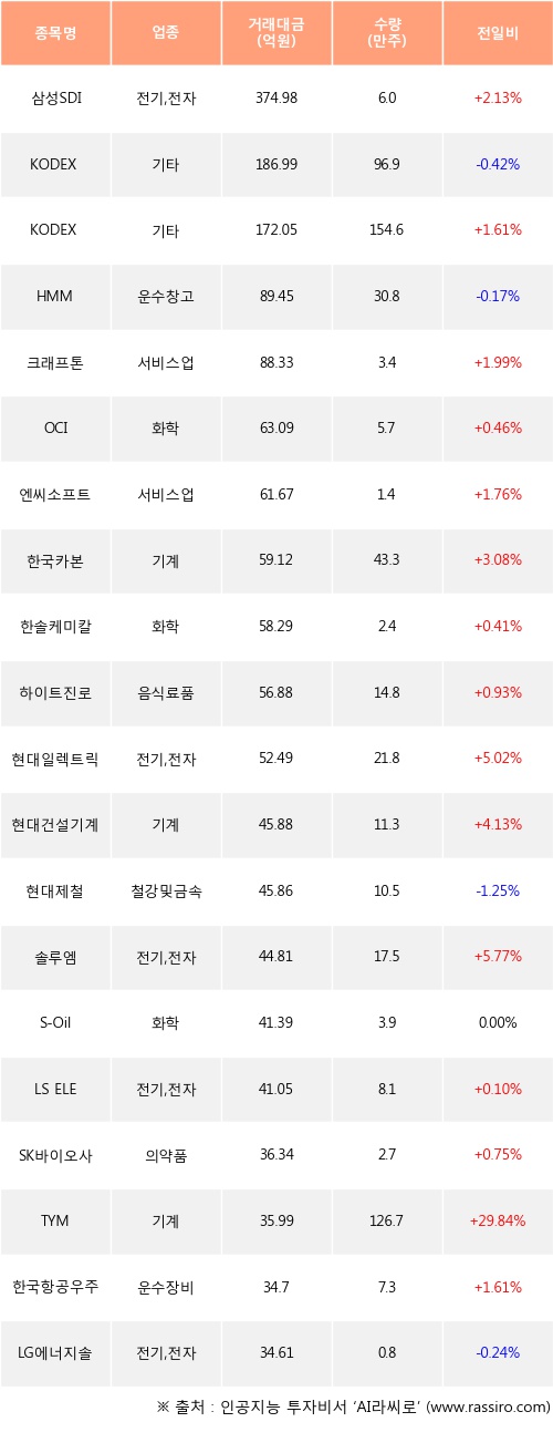 삼성SDI, KODEX 코스닥150레버리지, 크래프톤 등은 전일 대비 주가가 상승했고, KODEX 레버리지, HMM, 현대제철 등은 주가가 하락했다.