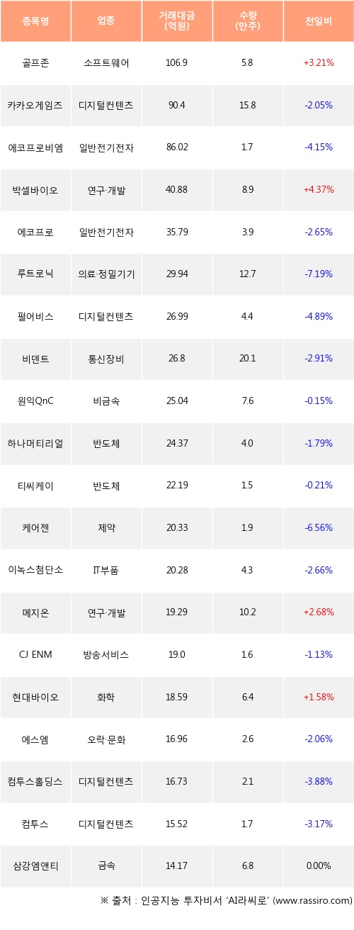 골프존, 박셀바이오, 메지온 등은 전일 대비 주가가 상승했고, 카카오게임즈, 에코프로비엠, 에코프로 등은 주가가 하락했다.