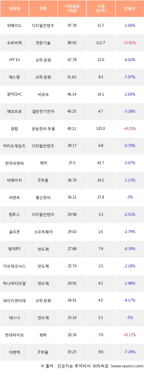 오르비텍, 광림, 현대바이오 등은 전일 대비 주가가 상승했고, 위메이드, JYP Ent., 에스엠 등은 주가가 하락했다.