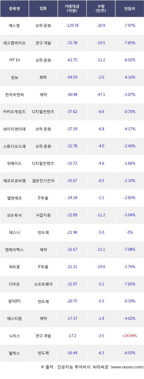 기관 투자자의 순매도 상위 20개 종목은 에스엠, 레고켐바이오, JYP Ent., 천보, 한국비엔씨, 카카오게임즈, 와이지엔터테인먼트, 스튜디오드래곤, 위메이드, 에코프로비엠등이다.