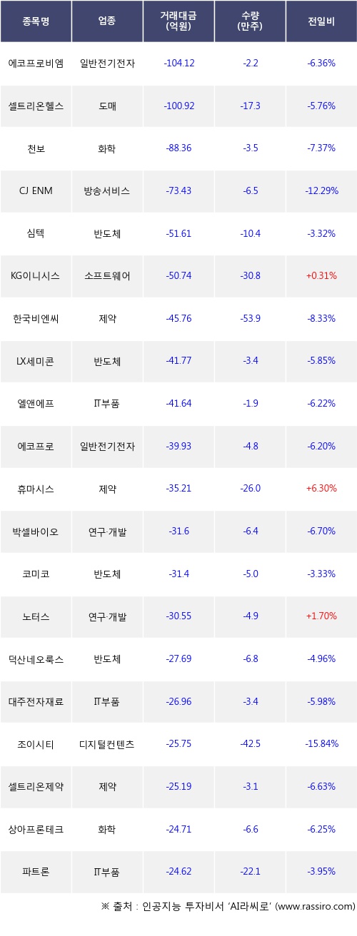 외국인 투자자의 순매도 상위 20개 종목은 에코프로비엠, 셀트리온헬스케어, 천보, CJ ENM, 심텍, KG이니시스, 한국비엔씨, LX세미콘, 엘앤에프, 에코프로등이다.