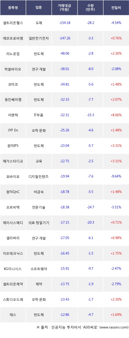 외국인 투자자의 순매도 상위 20개 종목은 셀트리온헬스케어, 에코프로비엠, 리노공업, 박셀바이오, 코미코, 동진쎄미켐, 이랜텍, JYP Ent., 원익IPS, 메가스터디교육등이다.