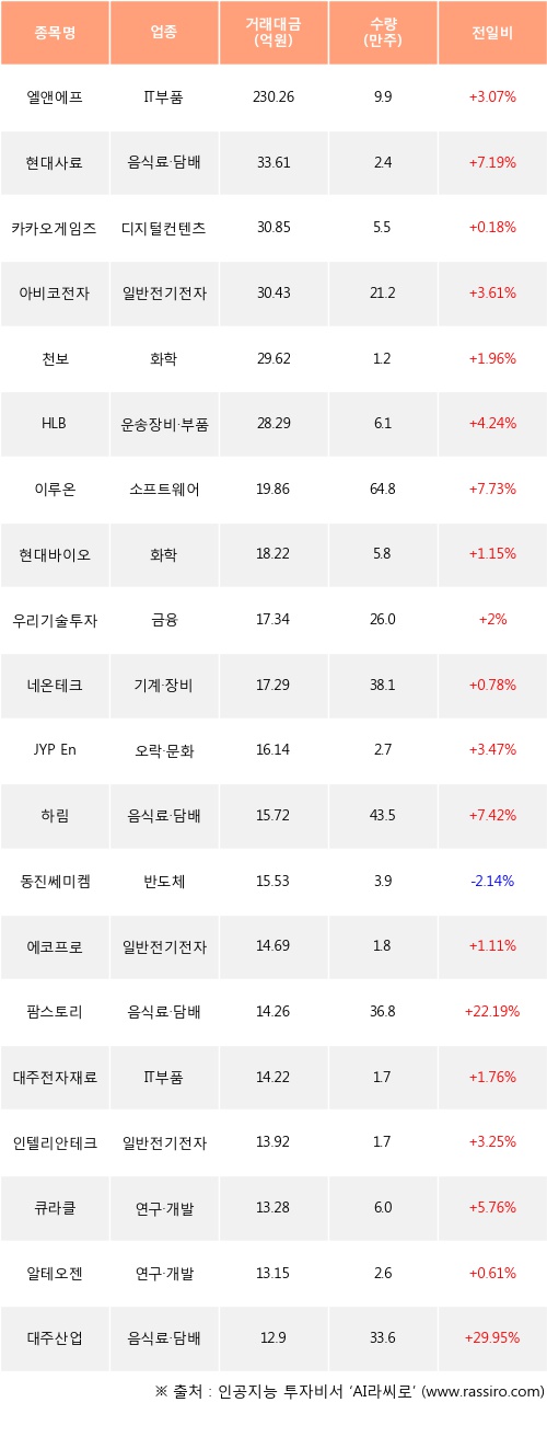 엘앤에프, 현대사료, 카카오게임즈 등은 전일 대비 주가가 상승했고, 동진쎄미켐 등은 주가가 하락했다.