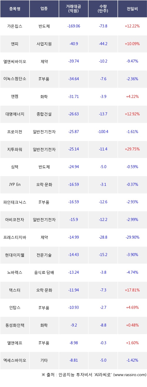 기관 투자자의 순매도 상위 20개 종목은 가온칩스, 엔피, 엘앤씨바이오, 이녹스첨단소재, 엔켐, 대명에너지, 프로이천, 지투파워, 심텍, JYP Ent.등이다.