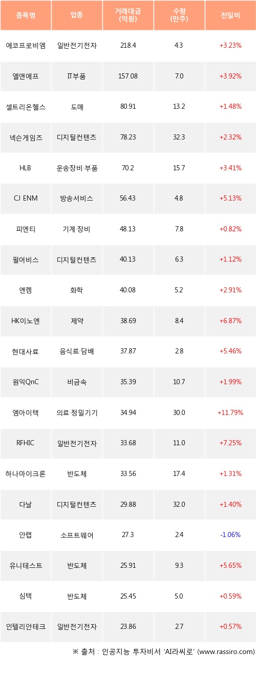 외국인 투자자의 순매수 상위 20개 종목은 에코프로비엠, 엘앤에프, 셀트리온헬스케어, 넥슨게임즈, HLB, CJ ENM, 피엔티, 펄어비스, 엔켐, HK이노엔등이다.