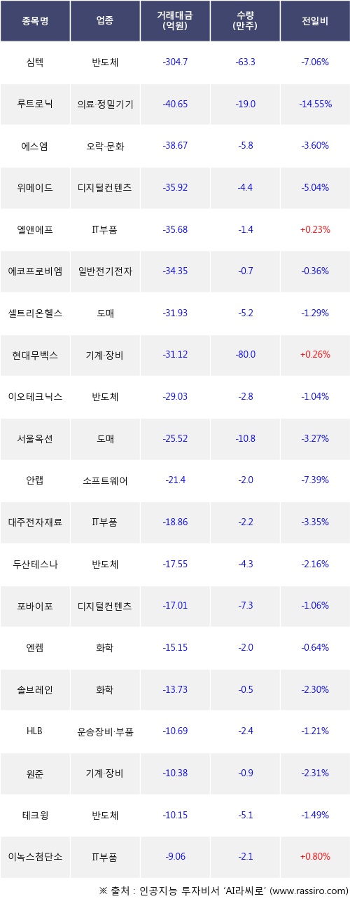 기관 투자자의 순매도 상위 20개 종목은 심텍, 루트로닉, 에스엠, 위메이드, 엘앤에프, 에코프로비엠, 셀트리온헬스케어, 현대무벡스, 이오테크닉스, 서울옥션등이다.