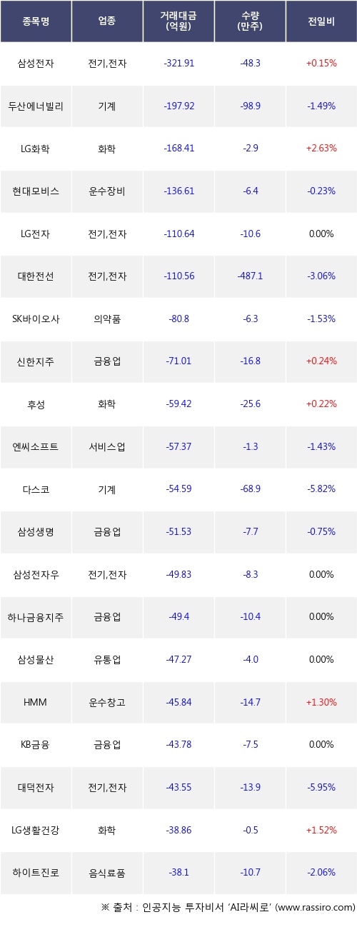 외국인 투자자의 순매도 상위 20개 종목은 삼성전자, 두산에너빌리티, LG화학, 현대모비스, LG전자, 대한전선, SK바이오사이언스, 신한지주, 후성, 엔씨소프트등이다.