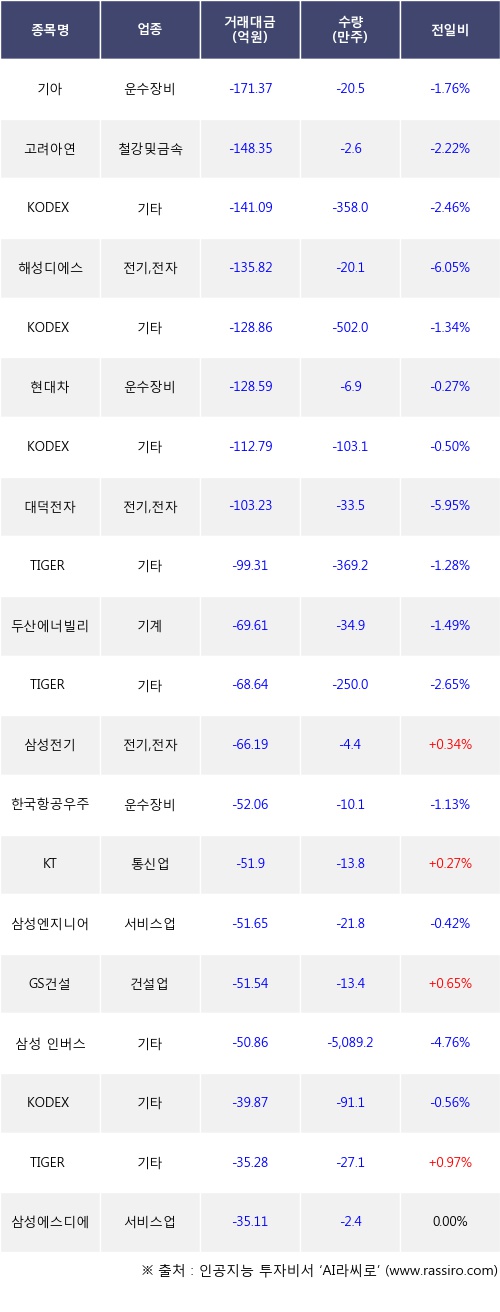 기관 투자자의 순매도 상위 20개 종목은 기아, 고려아연, KODEX WTI원유선물인버스(H), 해성디에스, KODEX 200선물인버스2X, 현대차, KODEX 코스닥150레버리지, 대덕전자, TIGER 200선물인버스2X, 두산에너빌리티등이다.