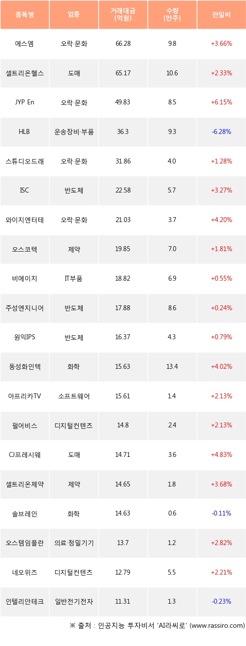 에스엠, 셀트리온헬스케어, JYP Ent. 등은 전일 대비 주가가 상승했고, HLB, 솔브레인, 인텔리안테크 등은 주가가 하락했다.