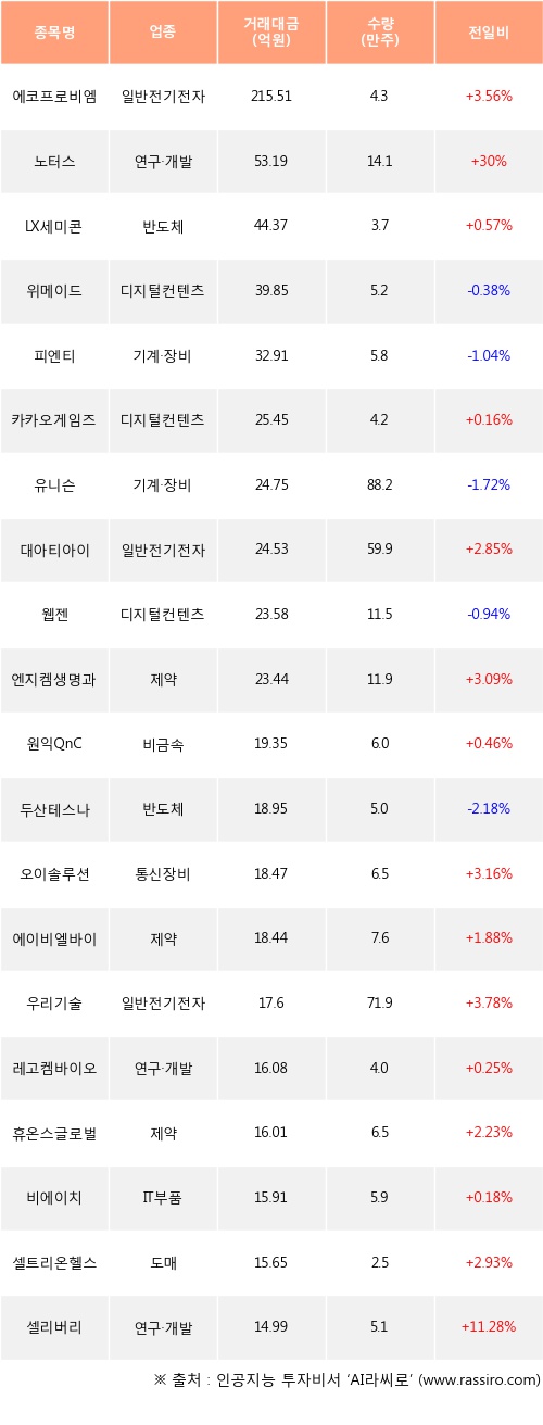 외국인 투자자의 순매수 상위 20개 종목은 에코프로비엠, 노터스, LX세미콘, 위메이드, 피엔티, 카카오게임즈, 유니슨, 대아티아이, 웹젠, 엔지켐생명과학등이다.