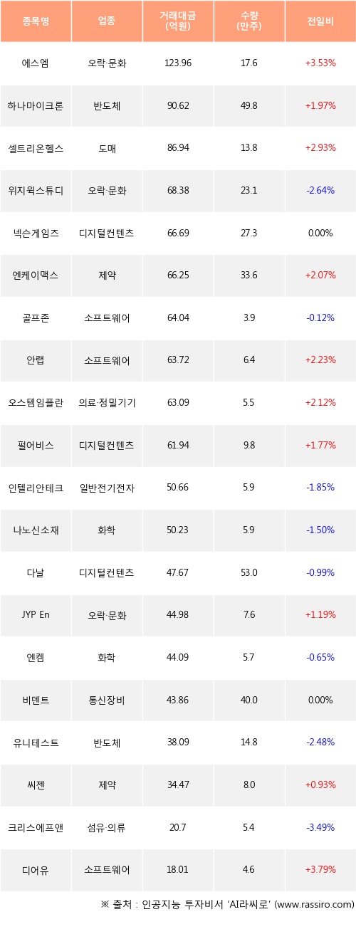 에스엠, 하나마이크론, 셀트리온헬스케어 등은 전일 대비 주가가 상승했고, 위지윅스튜디오, 골프존, 인텔리안테크 등은 주가가 하락했다.