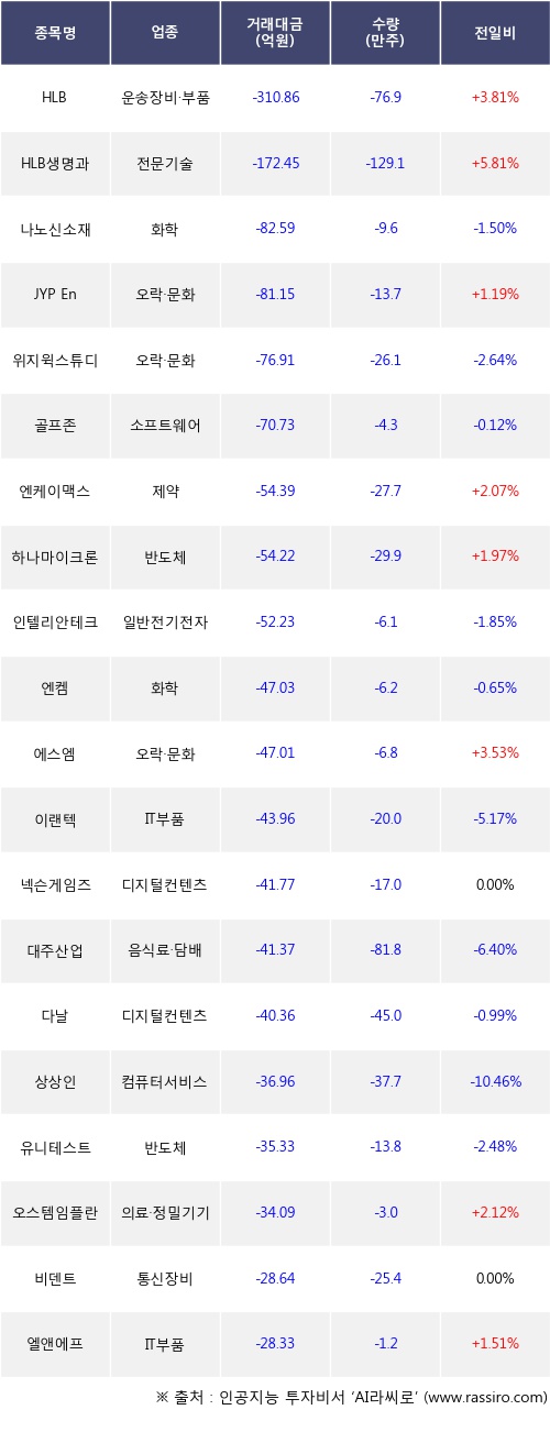 외국인 투자자의 순매도 상위 20개 종목은 HLB, HLB생명과학, 나노신소재, JYP Ent., 위지윅스튜디오, 골프존, 엔케이맥스, 하나마이크론, 인텔리안테크, 엔켐등이다.