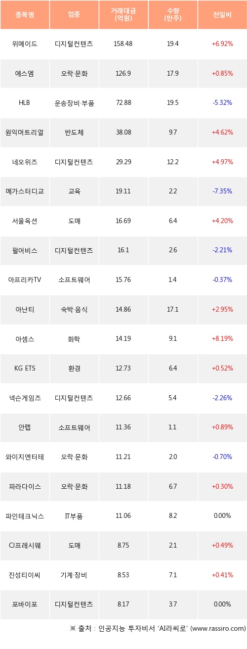 기관 투자자의 순매수 상위 20개 종목은 위메이드, 에스엠, HLB, 원익머트리얼즈, 네오위즈, 메가스터디교육, 서울옥션, 펄어비스, 아프리카TV, 아난티등이다.