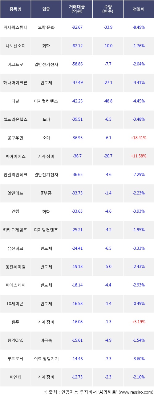 기관 투자자의 순매도 상위 20개 종목은 위지윅스튜디오, 나노신소재, 에코프로, 하나마이크론, 다날, 셀트리온헬스케어, 공구우먼, 씨아이에스, 인텔리안테크, 엘앤에프등이다.