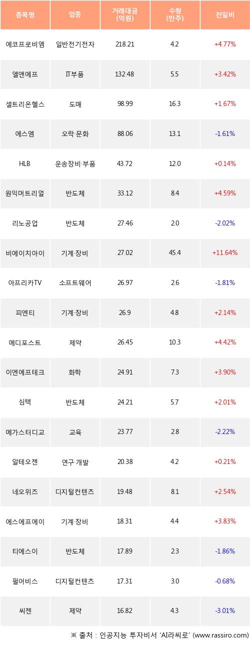 에코프로비엠, 엘앤에프, 셀트리온헬스케어 등은 전일 대비 주가가 상승했고, 에스엠, 리노공업, 아프리카TV 등은 주가가 하락했다.