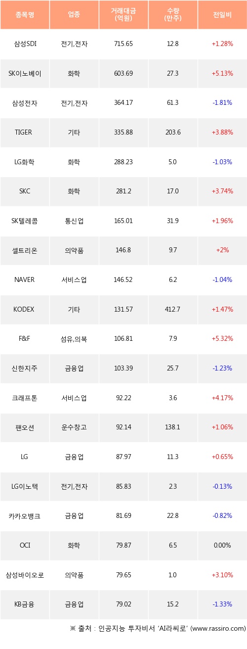 삼성SDI, SK이노베이션, TIGER 차이나전기차SOLACTIVE 등은 전일 대비 주가가 상승했고, 삼성전자, LG화학, NAVER 등은 주가가 하락했다.