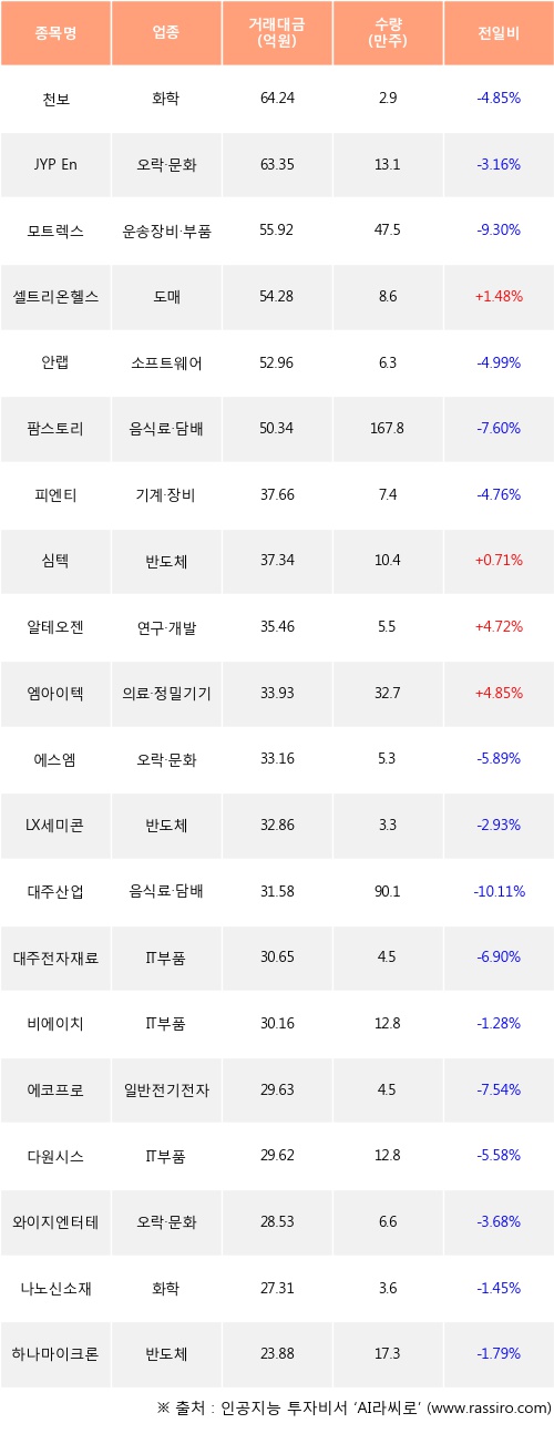 셀트리온헬스케어, 심텍, 알테오젠 등은 전일 대비 주가가 상승했고, 천보, JYP Ent., 모트렉스 등은 주가가 하락했다.
