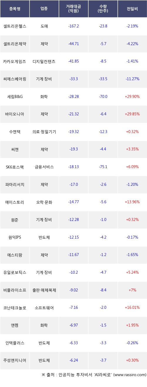 기관 투자자의 순매도 상위 20개 종목은 셀트리온헬스케어, 셀트리온제약, 카카오게임즈, 씨에스베어링, 세림B&G, 바이오니아, 수젠텍, 씨젠, SK6호스팩, 파마리서치등이다.
