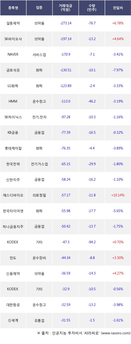 외국인 투자자의 순매도 상위 20개 종목은 일동제약, SK바이오사이언스, NAVER, 금호석유, LG화학, HMM, SK하이닉스, KB금융, 롯데케미칼, 한국전력등이다.