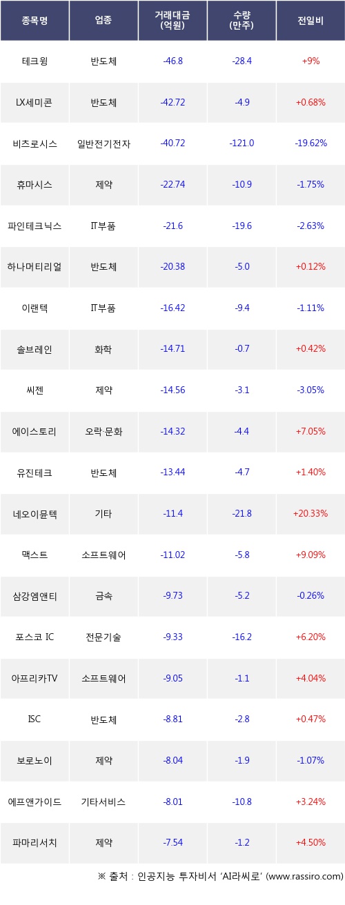 기관 투자자의 순매도 상위 20개 종목은 테크윙, LX세미콘, 비츠로시스, 휴마시스, 파인테크닉스, 하나머티리얼즈, 이랜텍, 솔브레인, 씨젠, 에이스토리등이다.