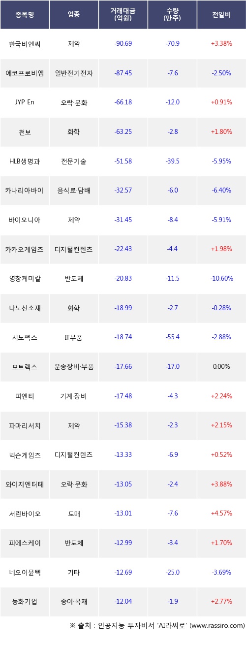 외국인 투자자의 순매도 상위 20개 종목은 한국비엔씨, 에코프로비엠, JYP Ent., 천보, HLB생명과학, 카나리아바이오, 바이오니아, 카카오게임즈, 영창케미칼, 나노신소재등이다.