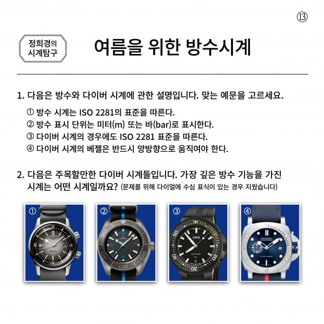 여름이면 시계는 새로운 옷을 입습니다. 땀이 잘 차는 가죽 스트랩보다는 러버 스트랩이나 금속으로 된 브레이슬릿으로 교체를 합니다. 그리고 요즘처럼 비가 많이 내리는 장마철, 휴가철은 방수가 잘 되고 견고하며 활동성이 뛰어난 방수 시계, 다이버 시계들의 인기가 급상승하는 때입니다. 예전에 방수 시계들은 대체로 크고 두껍고 무거웠는데 요즘 나오는 방수 시계들은 소재의 변화로 가볍고, 밴드를 교환하기도 쉬워 패셔너블하게 착용할 수 있습니다. 방수&다이버 시계에 대해 살펴볼 수 있는 문제를 준비했습니다.