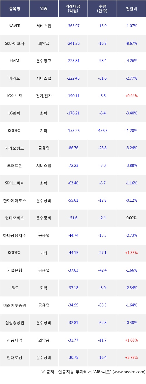 외국인 투자자의 순매도 상위 20개 종목은 NAVER, SK바이오사이언스, HMM, 카카오, LG이노텍, LG화학, KODEX 200선물인버스2X, 카카오뱅크, 크래프톤, SK이노베이션등이다.