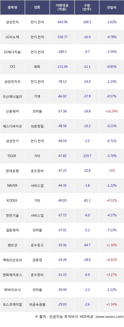 외국인 투자자의 순매도 상위 20개 종목은 삼성전자, LG이노텍, LG에너지솔루션, OCI, 삼성전자우, 두산에너빌리티, 신풍제약, 에스디바이오센서, 삼성전기, TIGER 원유선물인버스(H)등이다.