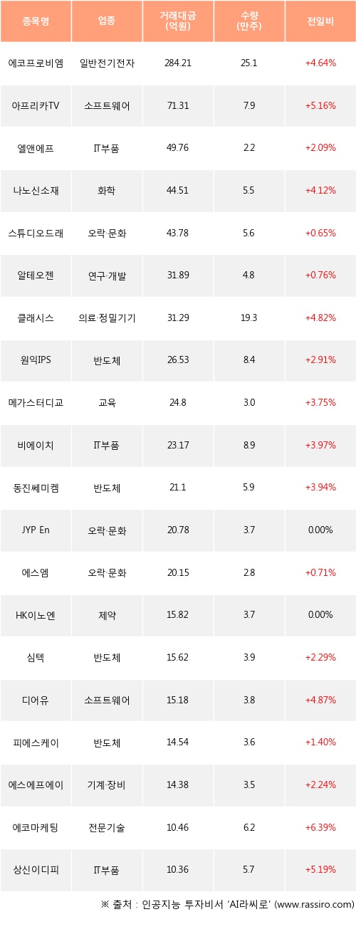 기관 투자자의 순매수 상위 20개 종목은 에코프로비엠, 아프리카TV, 엘앤에프, 나노신소재, 스튜디오드래곤, 알테오젠, 클래시스, 원익IPS, 메가스터디교육, 비에이치등이다.