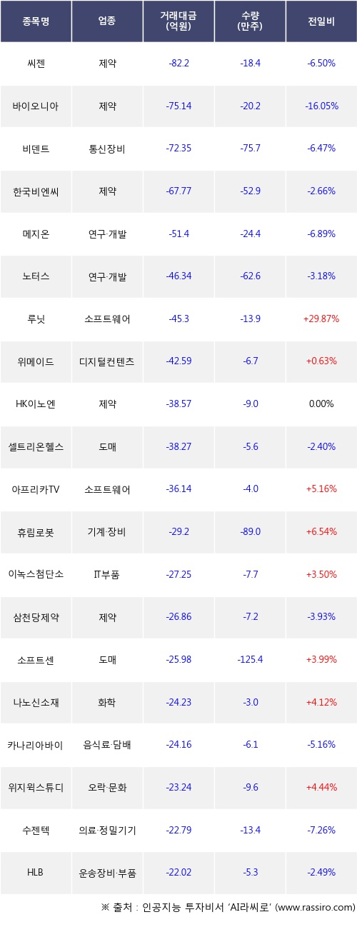 외국인 투자자의 순매도 상위 20개 종목은 씨젠, 바이오니아, 비덴트, 한국비엔씨, 메지온, 노터스, 루닛, 위메이드, HK이노엔, 셀트리온헬스케어등이다.