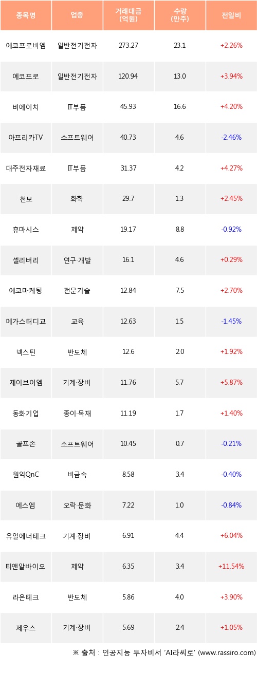 에코프로비엠, 에코프로, 비에이치 등은 전일 대비 주가가 상승했고, 아프리카TV, 휴마시스, 메가스터디교육 등은 주가가 하락했다.