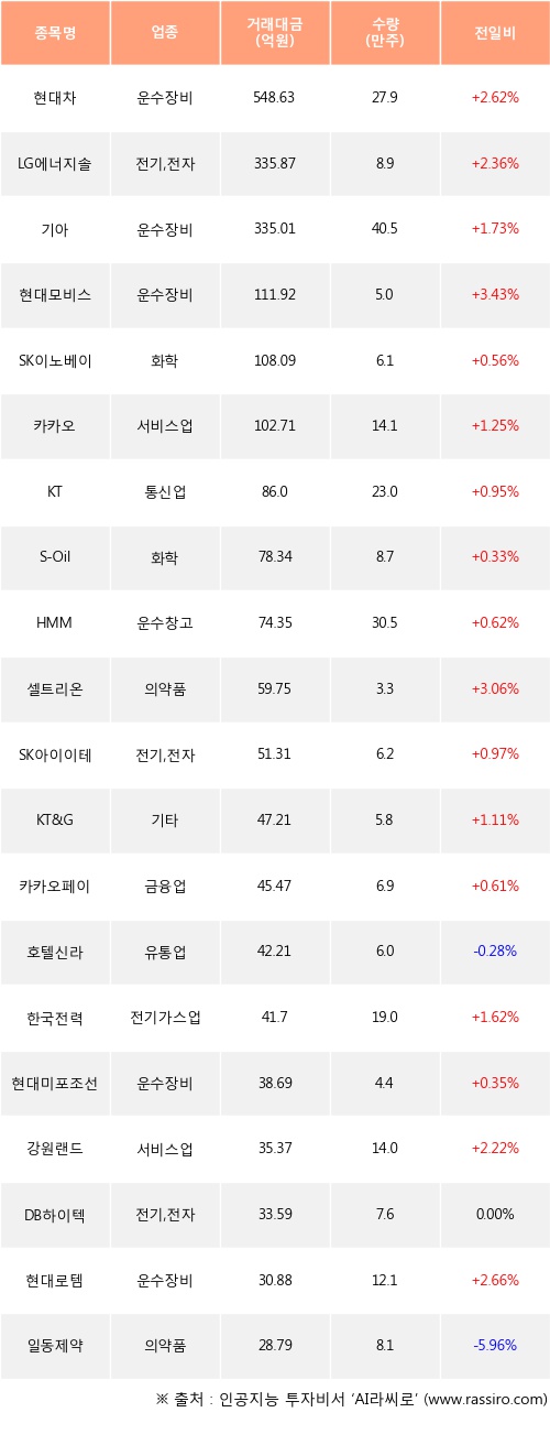 외국인 투자자의 순매수 상위 20개 종목은 현대차, LG에너지솔루션, 기아, 현대모비스, SK이노베이션, 카카오, KT, S-Oil, HMM, 셀트리온등이다.