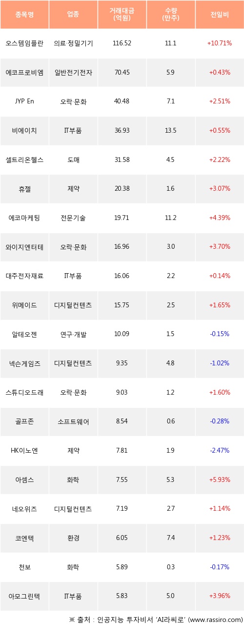 기관 투자자의 순매수 상위 20개 종목은 오스템임플란트, 에코프로비엠, JYP Ent., 비에이치, 셀트리온헬스케어, 휴젤, 에코마케팅, 와이지엔터테인먼트, 대주전자재료, 위메이드등이다.